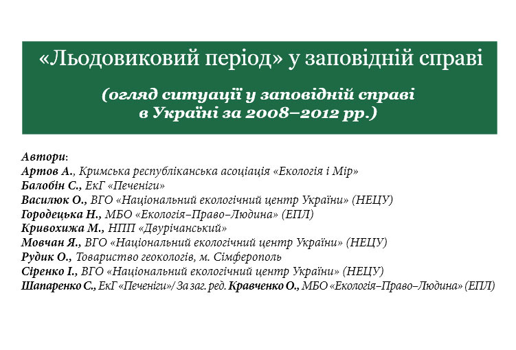 У своєму огляді фахівці із заповідної справи – члени громадських екологічних та еколого-правових організацій, висловлюють своє бачення ситуації, яка складається в цій сфері в Україні. Своє дослідження вони виклали у виданні «Льдовиковий період у заповідній справі України», яке вийшло як спеціальний випуск журналу «Екологія. Право. Людина». Дослідження містить огляд проблем заповідної галузі, аналіз виконання чинних документів державного рівня, що мають відношення до заповідної справи та перелік конкретних рекомендацій для державних органів, виконання яких може сприяти вирішенню виявлених в огляді проблем. «Льдовиковий період…» розрахований на журналістів, депутатів та посадовців всіх рівнів.