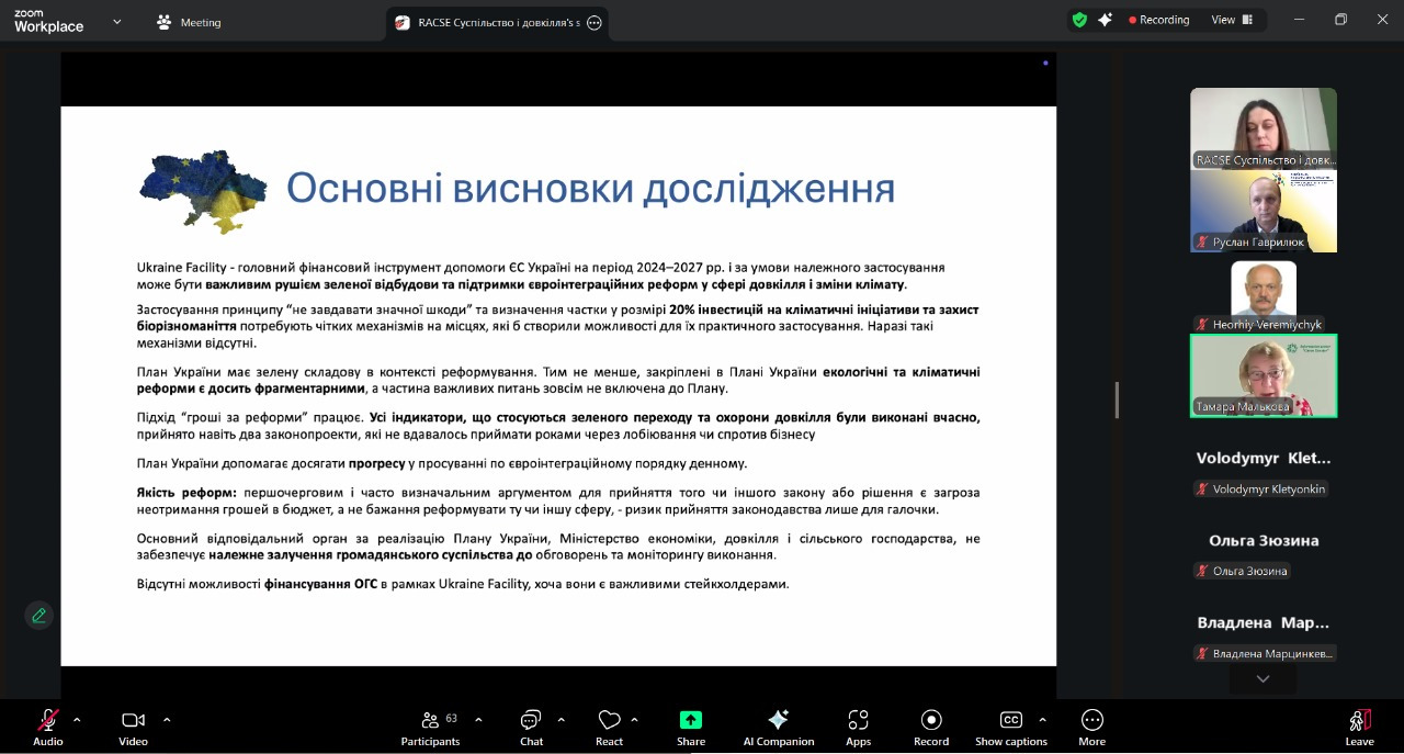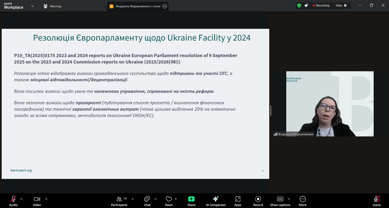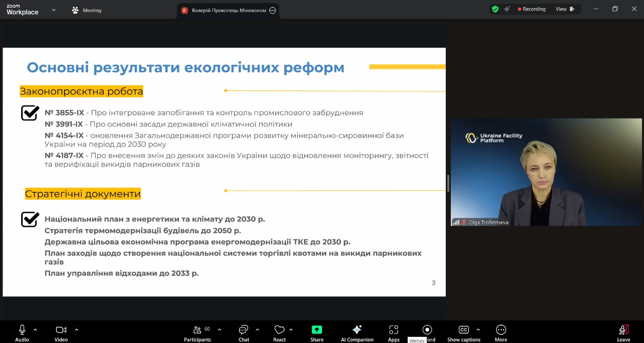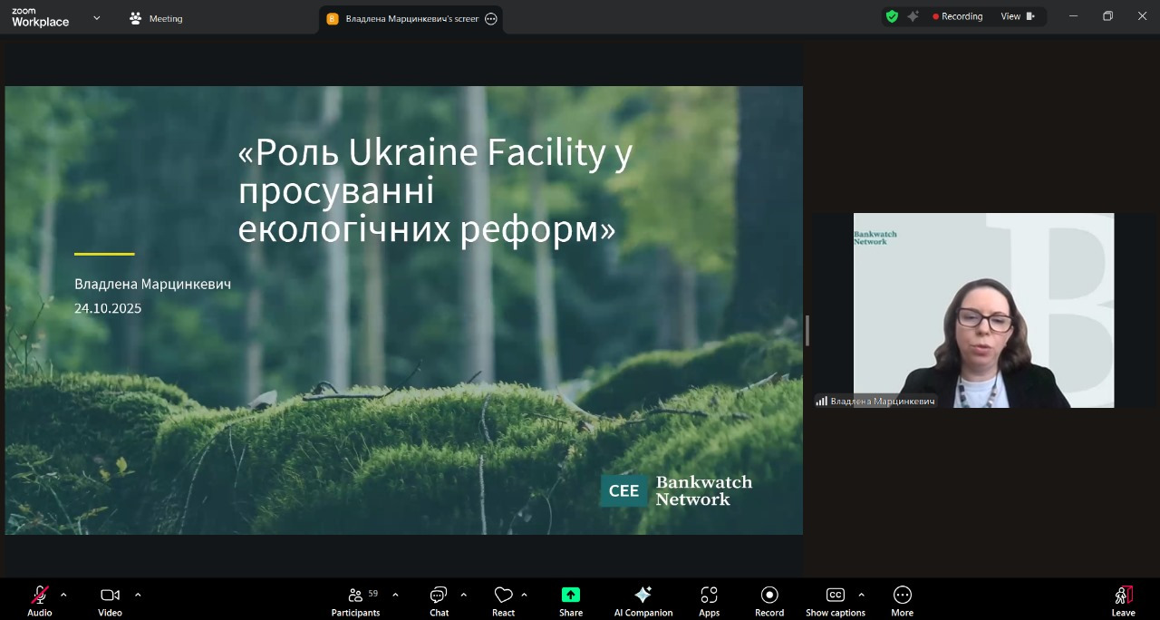 24 жовтня 2025 року під час онлайн-обговорення “Роль Ukraine Facility у просуванні екологічних реформ” НЕЦУ спільно з колегами презентували аналітичну записку “Екологічний вимір Ukraine Facility та Плану України: стан справ і рекомендації”.