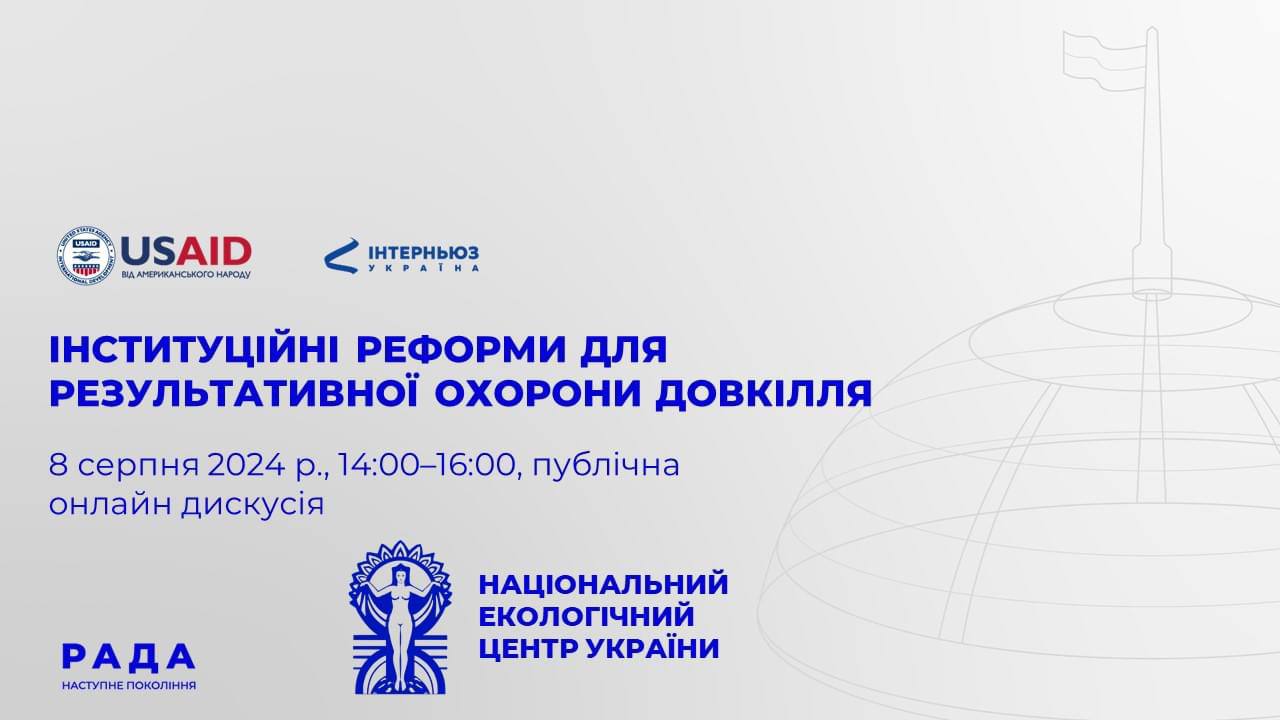 Запрошуємо долучитися до публічної дискусії «ІНСТИТУЦІЙНІ РЕФОРМИ ДЛЯ РЕЗУЛЬТАТИВНОЇ ОХОРОНИ ДОВКІЛЛЯ», яку Національний екологічний центр України проводить онлайн у четвер, 8 серпня 2024 р. з 14:00 до 16:00.