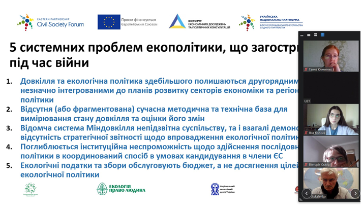Захід став підсумковим в реалізації ініціативи «Оцінка впровадження екологічної політики в Україні», що виконувалась в рамках проєкту Підтримка діяльності Української національної платформи Форуму громадянського суспільства Східного партнерства 2021-2023 рр.», який реалізує Інститут економічних досліджень та політичних консультацій за фінансової підтримки Європейського Союзу.