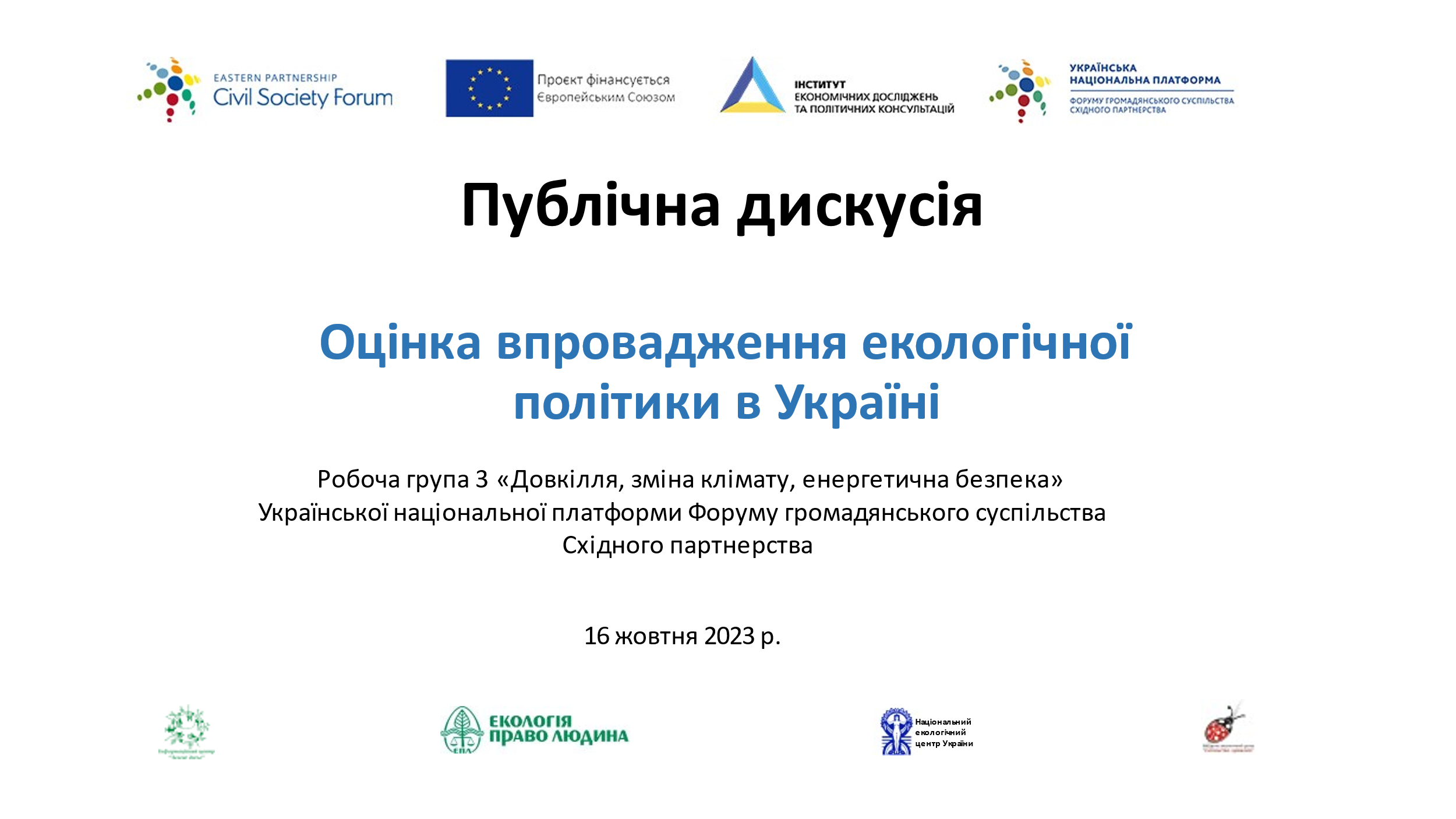 Захід став підсумковим в реалізації ініціативи «Оцінка впровадження екологічної політики в Україні», що виконувалась в рамках проєкту Підтримка діяльності Української національної платформи Форуму громадянського суспільства Східного партнерства 2021-2023 рр.», який реалізує Інститут економічних досліджень та політичних консультацій за фінансової підтримки Європейського Союзу.