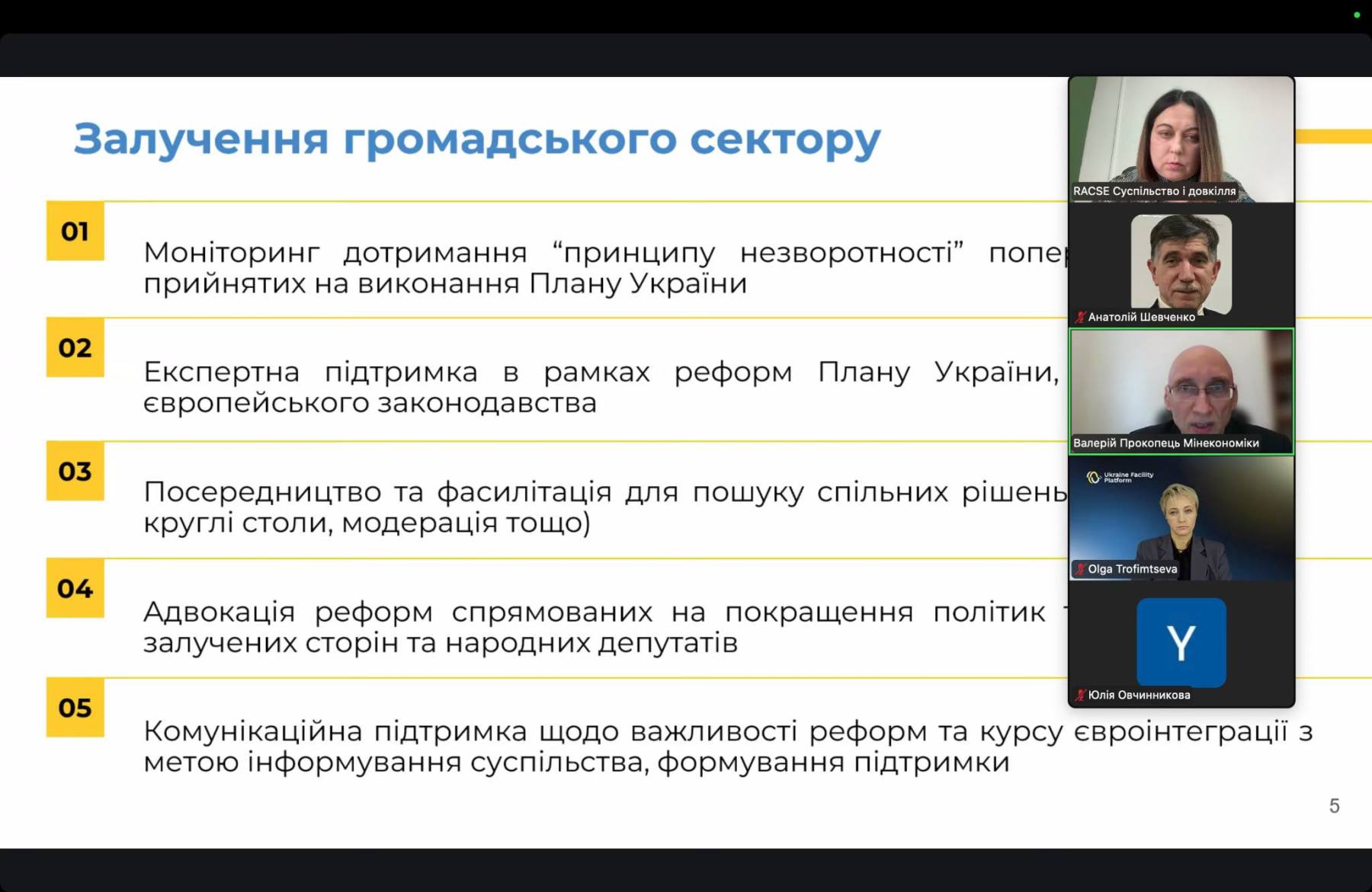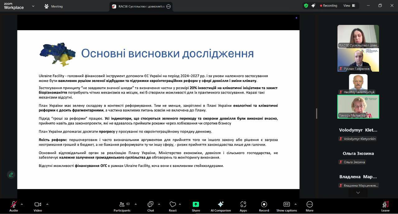 Під час цього заходу було представлено основні висновки та рекомендації аналітичної записки “Екологічний вимір Ukraine Facility та Плану України — стан справ і рекомендації”, підготовленої членами робочої групи 3 “Довкілля, зміни клімату та енергетична безпека” Української національної платформи Форуму громадянського суспільства Східного партнерства – Ресурсно-аналітичним центром “Суспільство і довкілля”, Національним екологічним центром України та Інформаційним центром “Зелене досьє”.