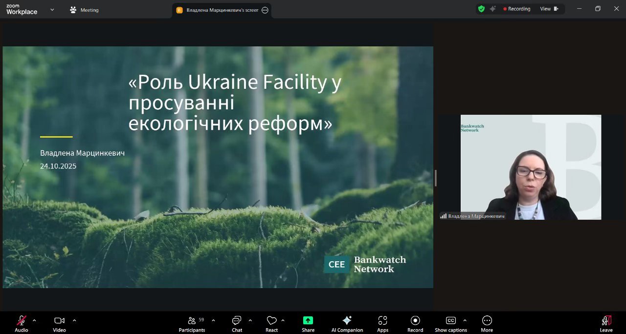 Минулого тижня Національний екологічний центр України долучився до конференції «Роль Ukraine Facility у просуванні екологічних реформ», присвяченої обговоренню екологічного виміру Плану України та можливостей громадянського суспільства у процесі зеленої трансформації.