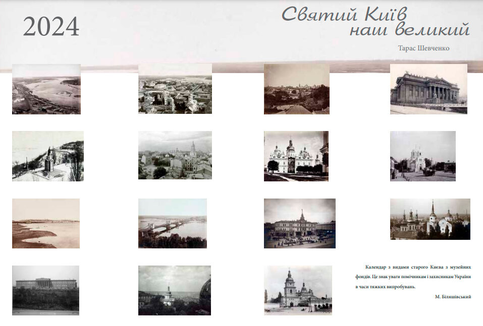 І тому природним стало рішення Національного екологічного центру України підтримати ініціативу Національного художнього музею України, до якої долучились Національна бібліотека України ім. В.І. Вернадського та Державна наукова архітектурно-будівельна бібліотека ім. В.Г. Заболотного, – видати на 2024 р. фотокалендар «Святий Київ наш великий…».