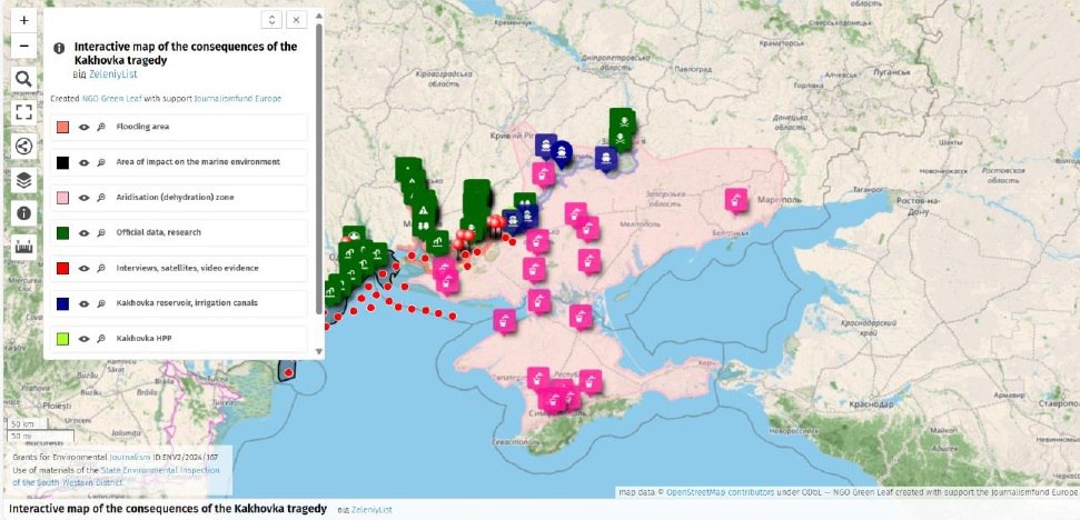 З перших часів Каховської катастрофи ГО «Зелений лист» збирає інформацію про руйнування греблі, спустошення Каховського водосховища та про наслідки цього жахливого терористичного акту росії. Всі зібрані матеріали вкладені в інтерактивну карту.