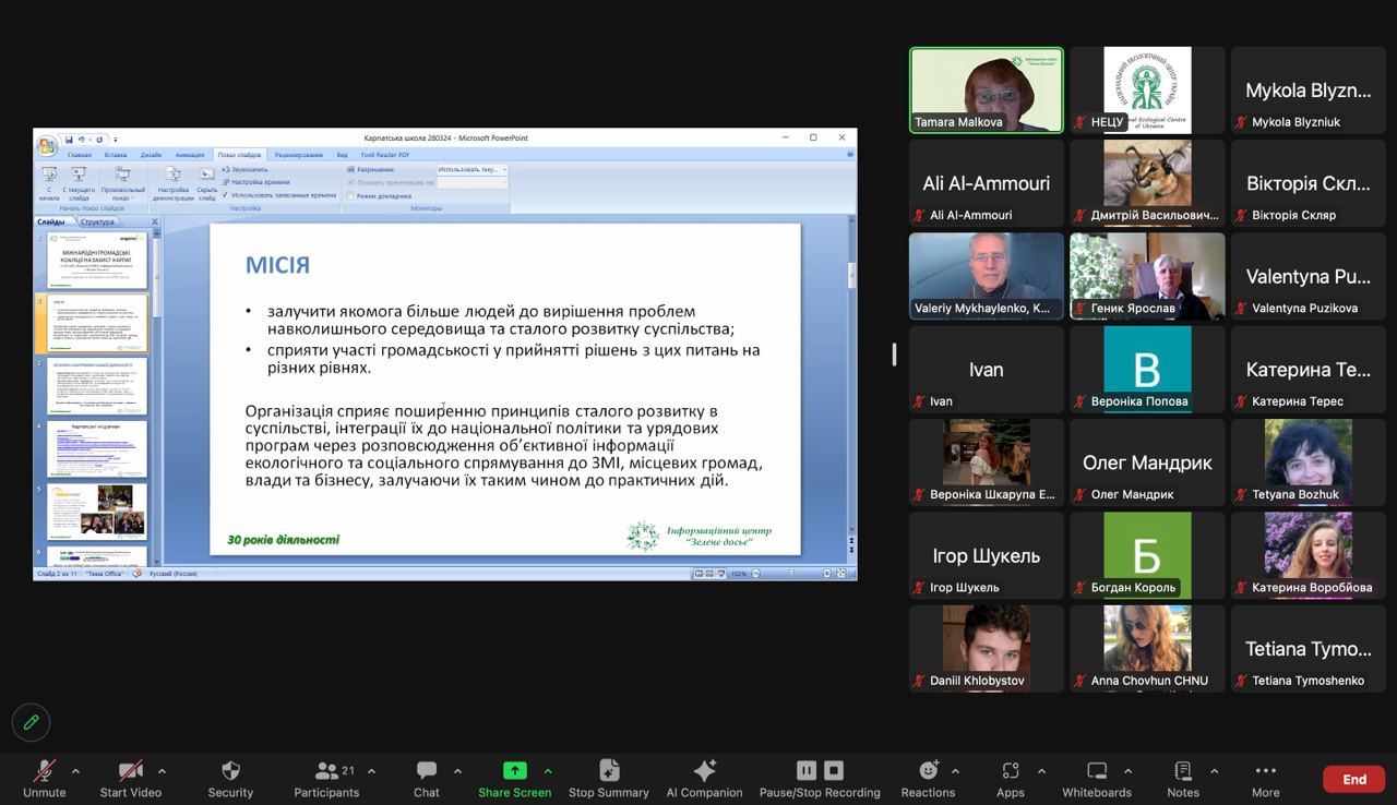 Семінар є мережевим заходом Міжнародної Карпатської школи-2024, яка має метою поширення неформальної освіти в українській частині Карпатського регіону. Відкриті пожежі є одним із найбільш масштабних чинників поширення забруднювальних речовин під час війни. Доповідачі висвітили результати згаданих міжнародних проєктів та практичний досвід української сторони в питаннях збереження та відновлення якості довкілля.
