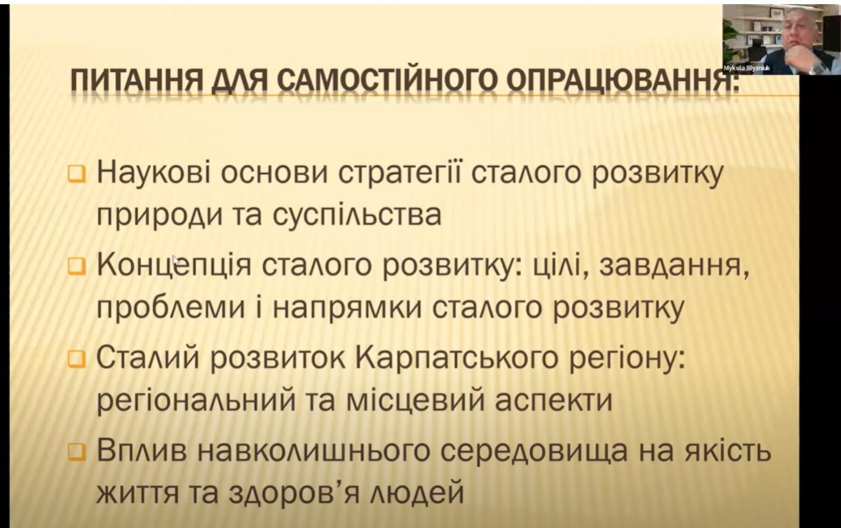 Валерій Михайленко у своїй презентації виствітлив тему сталого розвитку, зокрема аспекти освіти для сталого розвитку та важливість перспектив цієї теми.