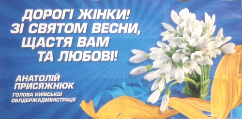 Днями на дорогах Київської області з’явились біл-борди, з яких вище керівництво держави та провідні політики вітають жінок зі святом 8 березня. Серед такий вітань і побажання «щастя та любові» від імені голови Київської обласної державної адміністрації Анатолія Присяжнюка. Вітальний біл-борд оздоблений великим зображенням букету підсніжника складчастого – рослини, занесеної до Червоної книги України, і забороненої для збирання і продажу.