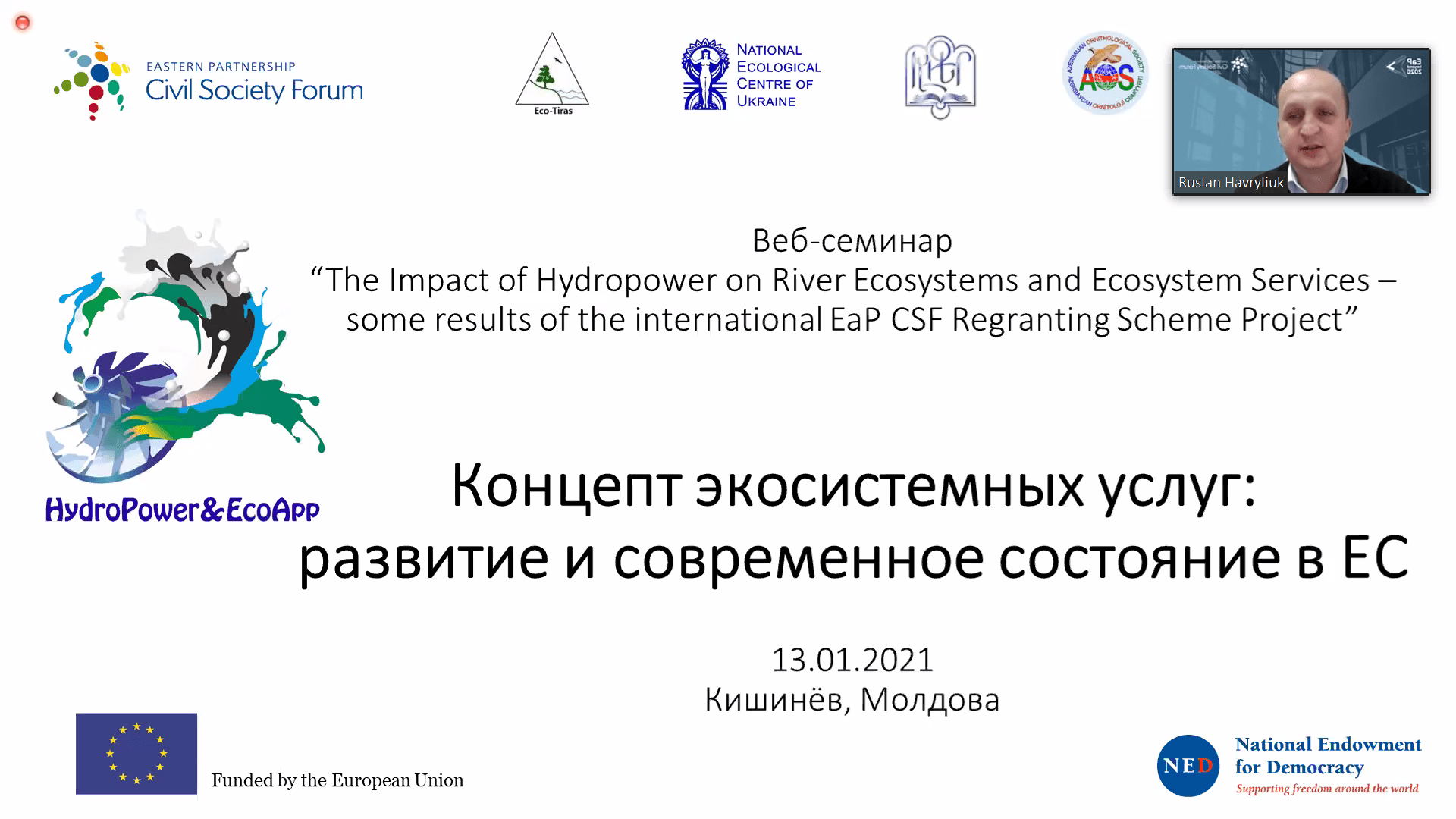 13 січня 2021 року відбувся міжнародний вебінар «Оцінка екосистемних послуг річкових басейнів – можливість оцінити справжній вплив гідроенергетики на довкілля», що пройшов у Кишиніві у зв’язку з завершенням проекту “Вплив гідроенергетики на річкові екосистеми і екосистемні послуги – деякі результати міжнародного проекту, реалізованого у рамках схеми регрантингу Форуму громадянського суспільства Східного партнерства Європейського Союзу».