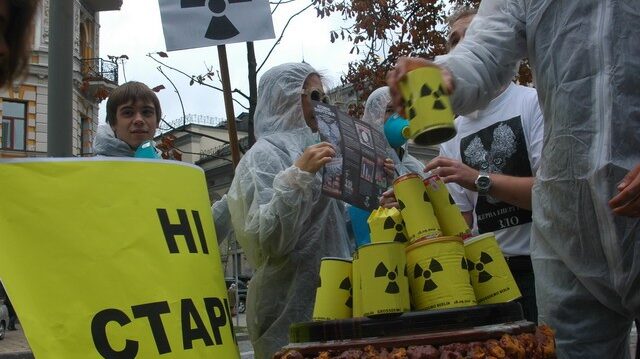 Київ, 18 вересня 2010. – Екологи збудували гірку “ядерних відходів” на знак протесту проти планів українського та німецького урядів подовжити експлуатацію ядерних реакторів у терміни, що перевищують проектні. Гірку консервних…