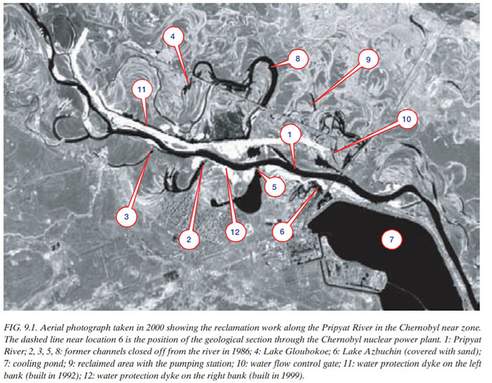 1 – річка Прип’ять; 2, 3, 5, 8 – колишні канали, які перекрили у 1986 році; 4 – озеро Глибоке; 6 – озеро Азбучин (покрите піском); 7 – охолоджувальне озеро; 9 – меліорована ділянка з насосною станцією; 10 – ворота контролю потоку води; 11 – водоохоронна дамба на лівому березі (збудована у 1992 році); 12 – водоохоронна дамба на правому березі (збудована у 1999 році).