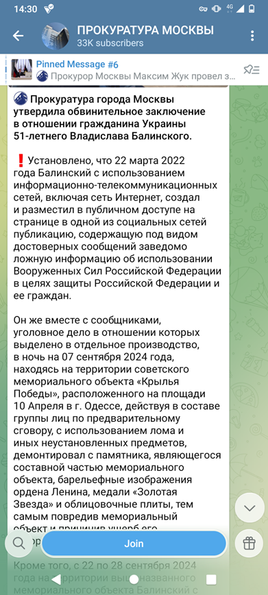 In October 2025 the Moscow City Prosecutor’s Office assigned Balinskyy’s case to court for an in absentia trial under the following provisions of the Criminal Code of the Russian Federation: