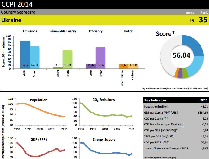 “Цей результат навіть гірший, ніж у сусідньої Білорусі та Індії, яка робить один із найбільших внесків у глобальне потепління”, – зазначає Марія Сторчило, експерт Національного екологічного центру України. За її словами, Україні надали таку позицію в рейтингу через відсутність державної політики забезпечення енергоефективності, малу частку відновлювальних джерел енергії й слабких міжнародних зобов’язаннь зі скорочення викидів. До того ж, до сих пір країна не ратифікувала поправку до Кіотського протоколу.