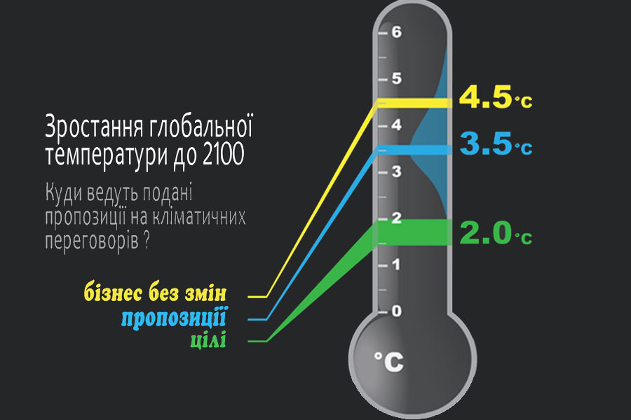 Незважаючи на прийняття амбітної глобальної цілі утримання глобального потепління на рівні 1,5-2°C, заявлені минулого року позиції країн по обмеженню викидів парникових газів ведуть світ до глобального потепління на 3,5°C і вище.
